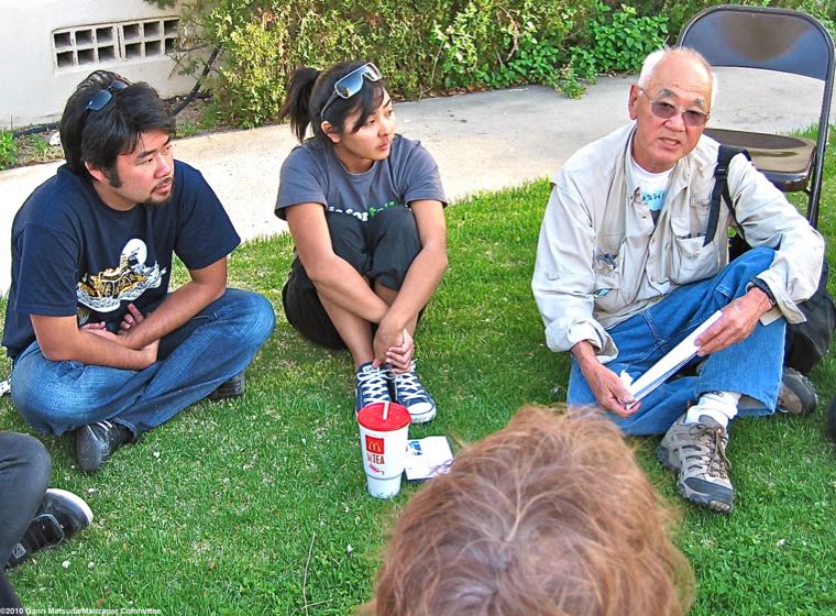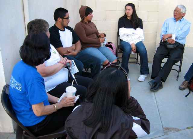 LEAD PHOTO: Eryn Tokuhara (center) and Matt Ichinose (left) listen intently to a former Japanese American concentration camp prisoner tell his story during a small group discussion at the 2010 Manzanar At Dusk program, held at Lone Pine High School on April 24, 2010. Photo: Gann Matsuda/Manzanar Committee.