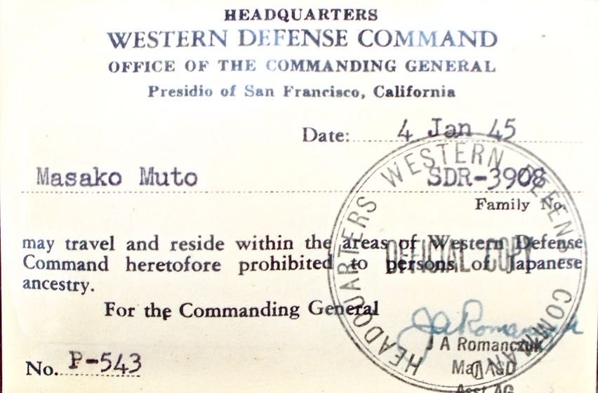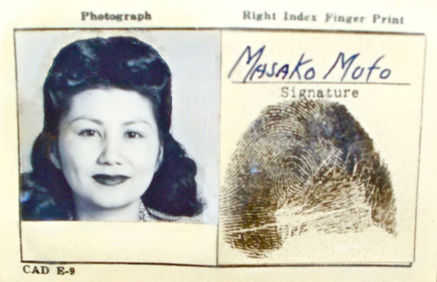 Above is Masako’s ID card, taken in 1945 (front and rear of the card is shown above), when the incarcerated families were allowed to travel back into the war restricted areas of California.
