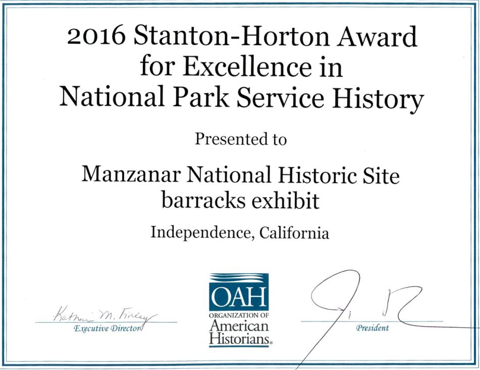 BLOOMINGTON, IN — During its annual meeting in Providence, Rhode Island, the Organization of American Historians (OAH) presented the Manzanar National Historic Site barracks exhibit with their prestigious 2016 Stanton-Horton Award for Excellence in National Park Service History, which is given annually to recognize excellence in historical projects for, by, and with the National Park Service and is intended to honor projects, parks, or programs that make the NPS a leader in promoting public understanding of and engagement with American History.