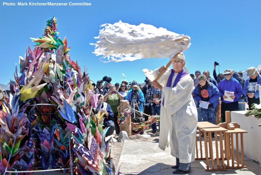 LEAD PHOTO: Rev. Alfred Tsuyuki of the Konko Church of Los Angeles performs the Shinto purification rite to open the interfaith service during the 48th Annual Manzanar Pilgrimage on Saturday, April 29, 2017, at the Manzanar National Historic Site. Photo: Mark Kirchner/Manzanar Committee.