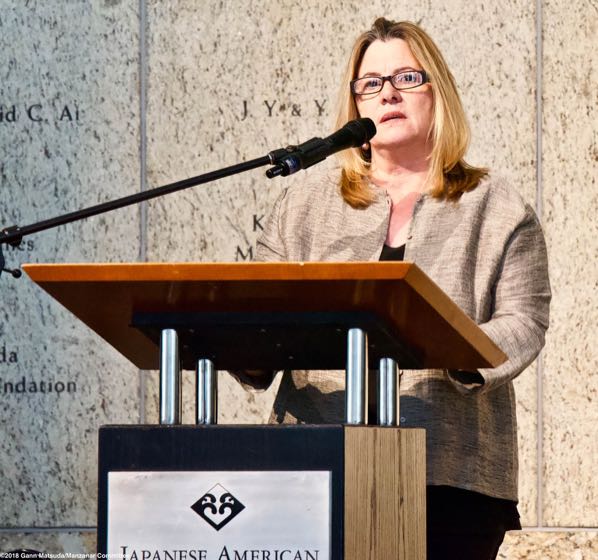 LEAD PHOTO: Japanese American National Museum President and CEO Ann Burroughs, shown here during the 2018 Los Angeles Day of Remembrance Program on February 17, 2018, at JANM in Los Angeles. Photo: Gann Matsuda/Manzanar Committee.