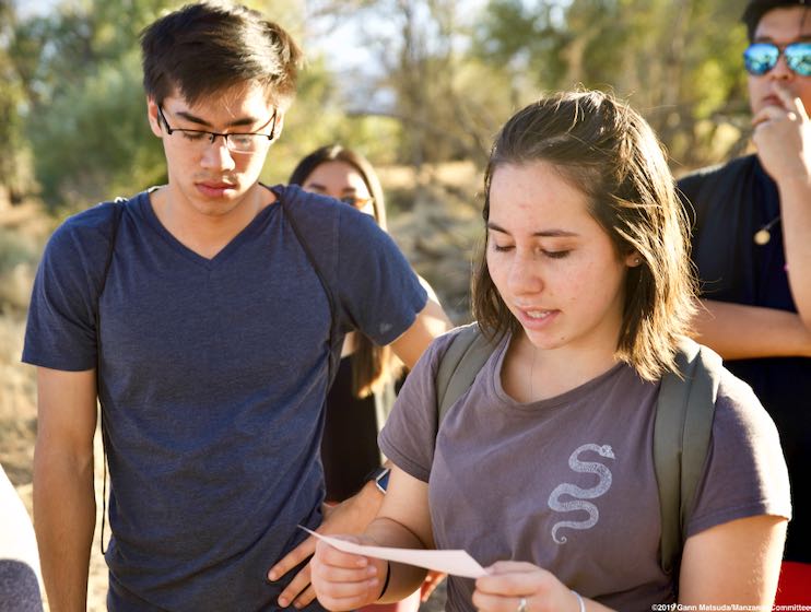 LEAD PHOTO: Sophia McDaniel (right), is shown here reading an oral history excerpt at the site of Manzanar’s Children’s Village, where 101 orphans were incarcerated during World War II. Photo from the 2019 Katari trip, November 2, 2019, at the Manzanar National Historic Site by Gann Matsuda/Manzanar Committee.