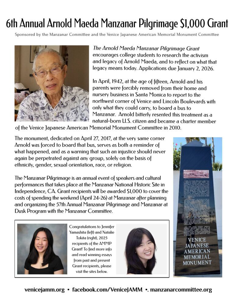 We are pleased to announce that the 6th annual Arnold Maeda Manzanar Pilgrimage Grant is open. The program provides a $1,000 Grant to encourage college students to research the activism and legacy of Arnold Maeda, and to reflect on what that legacy means today.
